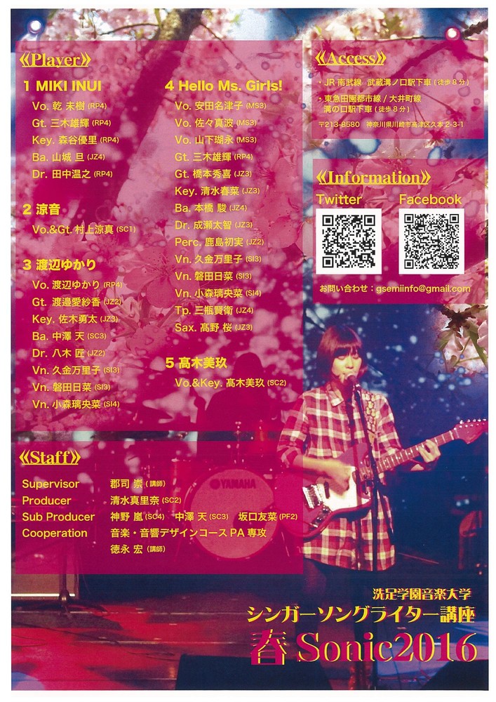 洗足学園音楽大学シンガーソングライター講座「春Sonic 2016」
