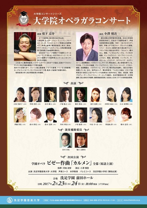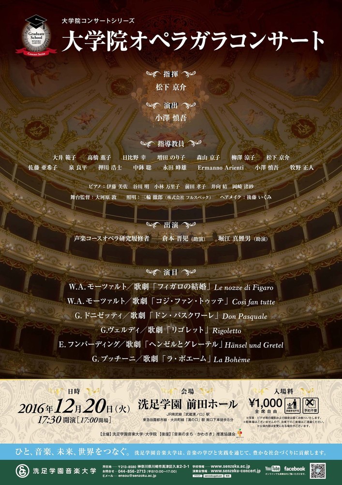 大学院オペラガラコンサート 指揮:松下 京介 演出:小澤 慎吾 出演:大学院 声楽コースオペラ研究履修者 プログラム W.A.モーツァルト/歌劇「フィガロの結婚」 W.A.モーツァルト/歌劇「コジ・ファン・トゥッテ」 G.ドニゼッティ/歌劇「ドン・パスクワーレ」 G.ヴェルディ/歌劇「リゴレット」 E.フンパーディング/歌劇「ヘンゼルとグレーテル」 G.プッチーニ/歌劇「ラ・ボエーム」 カテゴリ: 大学院の演奏会 ジャンル: オペラ・声楽