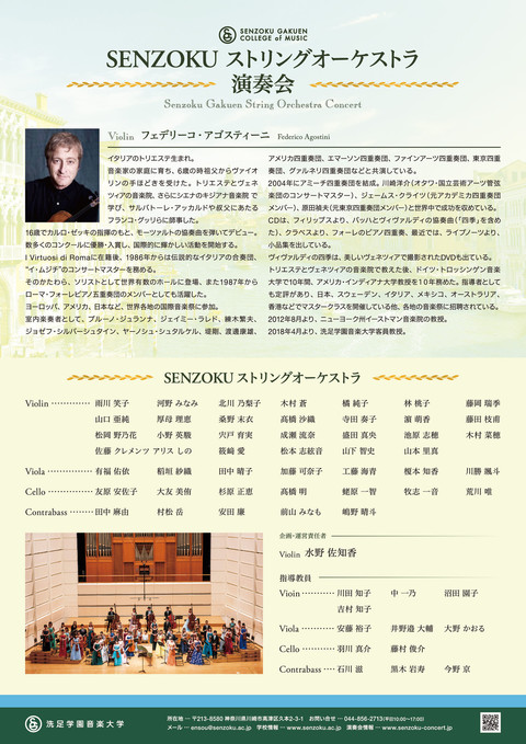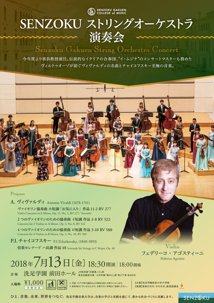 ストリングオーケストラ演奏会 【指揮】 フェデリーコ ・アゴスティーニ プログラム A.ヴィヴァルディ/ヴァイオリン協奏曲 ホ短調『お気に入り』 op.11-2, RV.277 A.ヴィヴァルディ/ 2つのヴァイオリンのための協奏曲 イ短調 op.3 No.8 RV 522 A.ヴィヴァルディ/ 4つのヴァイオリンのための協奏曲 ロ短調 op.3 No.10 RV 580 P.I.チャイコフスキー/弦楽セレナード op.48 カテゴリ: 大学の演奏会 ジャンル: アンサンブル系
