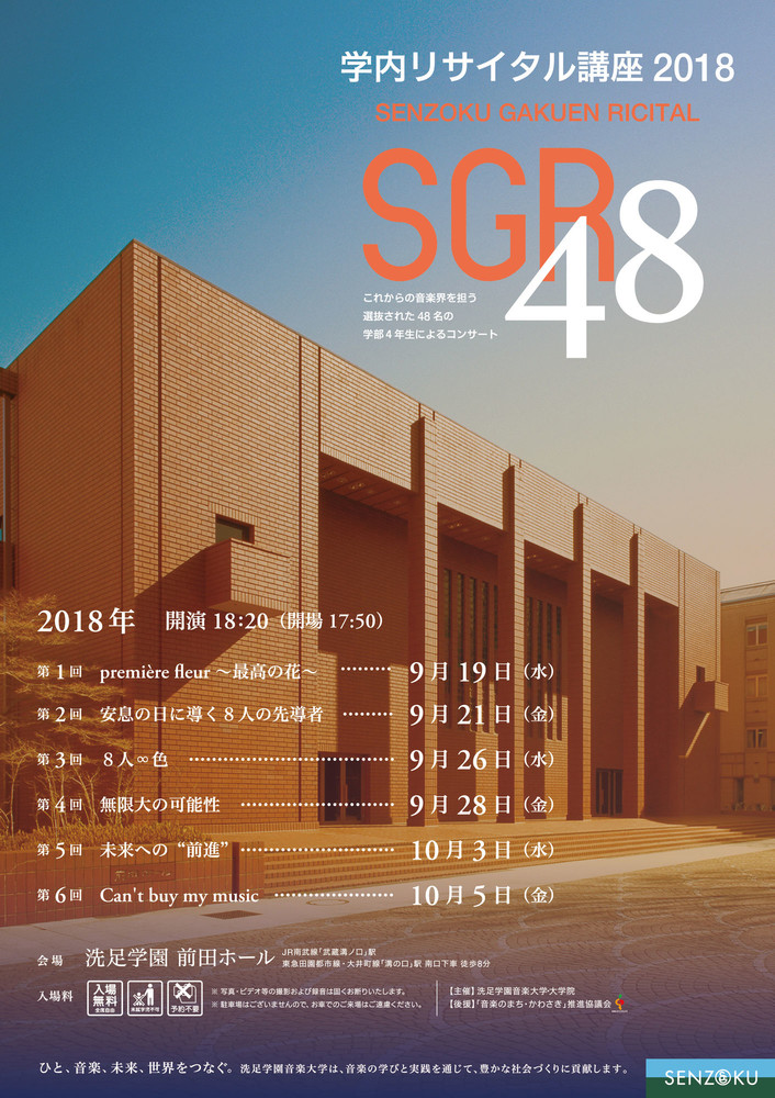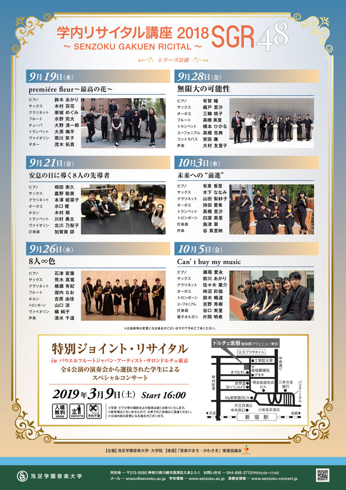 学内リサイタル・ジョイントリサイタル② 安息の日に導く8人の先導者 【出演】 ピアノ:相田 実久 サックス:嘉野 聡美 クラリネット:本澤 姫菜子 オーボエ:水口 優 ホルン:木村 萌 トランペット:川村 勇太 ヴァイオリン:北川 乃梨子 打楽器:加賀美 諄 カテゴリ: 大学の演奏会 ジャンル: リサイタル